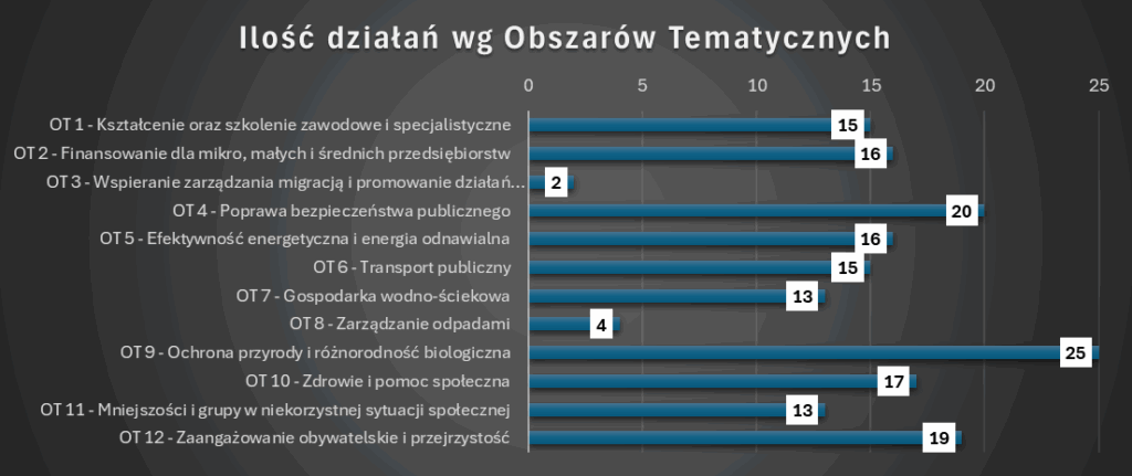 Kolejne najpopularniejsze obszary tematyczne to: OT 4 – Poprawa bezpieczeństwa publicznego (20 działań), OT 12 – Zaangażowanie obywatelskie i przejrzystość (19 działań) i OT 10 – Zdrowie i pomoc społeczna (17 działań).